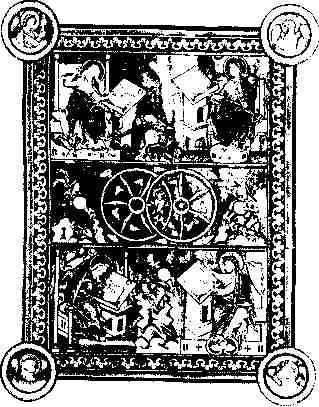 Рис. 109. Четыре евангелиста со своими символами и четыре реки рая. В центре колеса Иезекииля с spiritus vitae, который "был в колесах" (Иезекииль 1:21). - Миниатюра в Евангелии, Ашаффенбург (13 век)