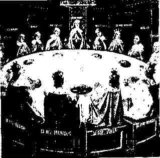 315 Мы находим примечательные параллели в писаниях Гийома де Дигюйвиля, настоятеля цистерцианского монастыря в Шале, нормандского поэта, который независимо от Данте создал три pelerinages между 1330 и 1355 годами: Les Pelerinages de la vie humane, de I'ame и de Jesus Christ.* Последняя песнь Pelerinage de I'ame включает видение Рая, состоящего из семи больших сфер, каждая из которых содержит семь меньших сфер.146 Все сферы вращаются, и это движение называется siecle (saeculum). Небесные siecles являются прототипами земных веков. Ангел-проводник поэта объясняет: "Когда святая Церковь заканчивает свои молитвы словами in saecula saeculorum (вовеки веков), она имеет ввиду не земное время, но вечность". В то же время siecles - сферические пространства, в которых обитает святость. Siecles и deux - идентичны. В высочайших небесах совершенного золота Король сидит на круглом троне, который сияет ярче солнца. Корона из драгоценных камней венчает его. Возле него, на круглом троне из коричневого кристалла, сидит Королева, ходатайствующая за грешников (рис.103).